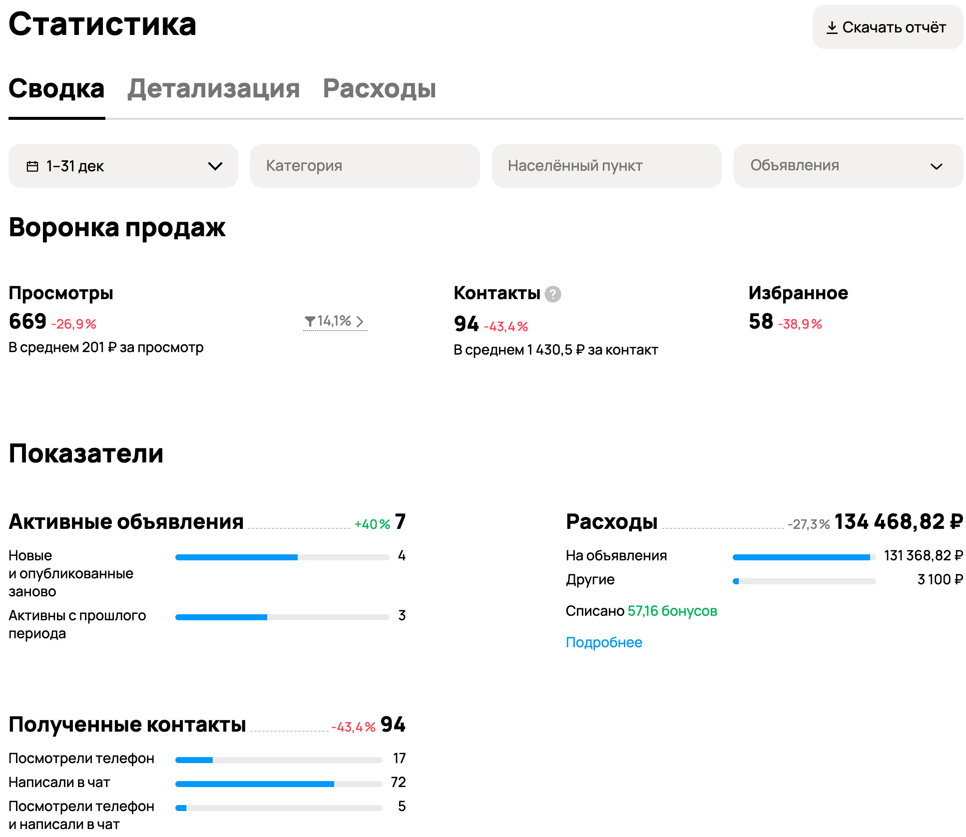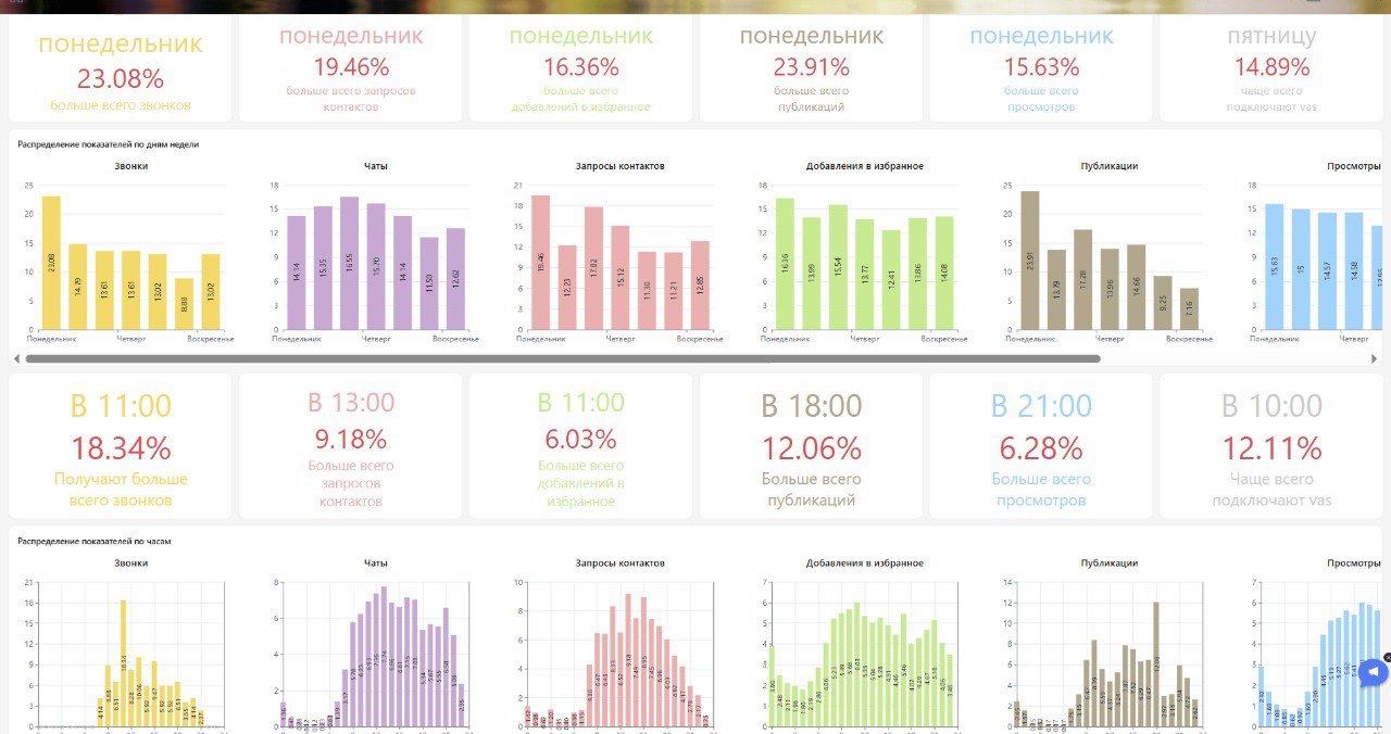 Мы заметили, что часть бюджета сливается в ночной период без результата. Просмотры есть – контактов нет. Поэтому мы стали на ночь скрывать объявления убирая деньги с аванса и пополняя его утром. Это помогло нам снизить стоимость контакта.